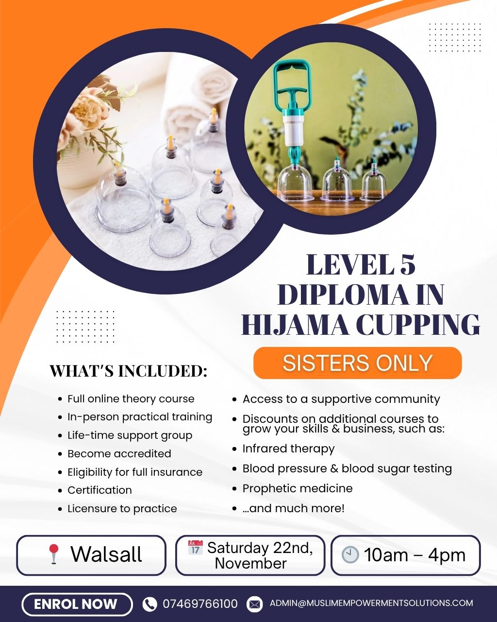 Join us for a unique Hijama learning experience, combining ancient tradition with modern, medically-approved methods. Gain hands-on cupping skills and explore preventive healthcare, all with Islamic validation and full accreditation. Online course theory to work through in your own time and in person practical training.